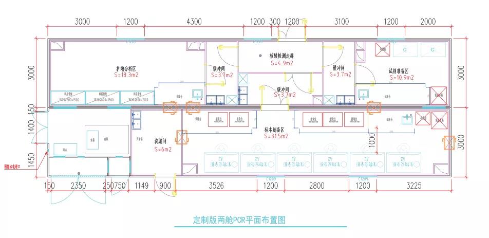 设计方案1.严格按照PCR实验室分区进行设计,三个功能分区:试剂准备区、标本制备区和产物扩增分析区,配置独立缓冲间。除此之外,配置洗消间和设备间。2.内置PCR走廊,便于观察各分区的操作情况;3.压力梯度按照试剂准备区-标本制备区-产物扩增分析区方向逐级递减,气流走向为单向流;缓冲间门口安装有压差表,可实时显示房间内的动态压力。方舱结构17500*5960*2980mm(长*宽*高)设计规范T/C